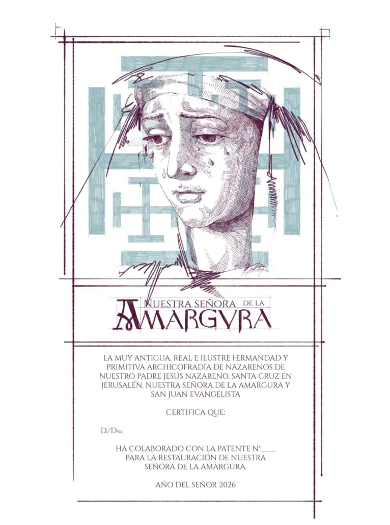 Desde estas líneas animamos a todos los hermanos, devotos y fieles en general a que colaboren en la restauración de la Santísima Virgen y tengan un recuerdo inolvidable que no es otro que su nombre sea introducido en el interior de nuestra imagen titular, Ntra. Sra. de la Amargura; además de esta patente que certificará dicha donación.